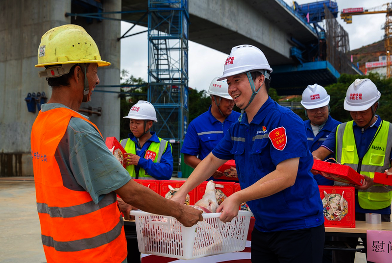 9月29日,中铁七局珠肇七标一分部开展节日祝福进现场慰问民工活动,向在跨G94高速公路大桥施工现场昼夜奋战的参建人员送上节日慰问与祝福。