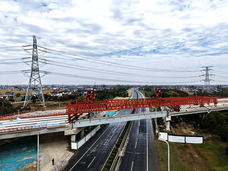 11月6日,中铁七局宁盐高速扬州段高邮湖西互通主线桥首片最大跨度箱梁架设完成。
